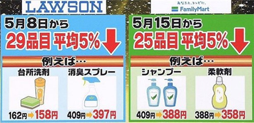 羅森和全家也迅速做出了反應(yīng)。5月8日起,羅森調(diào)整了店內(nèi)29款日用品的售價;5月15日起,全家的洗滌劑、洗發(fā)水等25款日用品也降價了。這三家便利店的降價幅度普遍達(dá)到了5%。緊接著,規(guī)模小一些的便利店Mini Stop也宣布要降價。