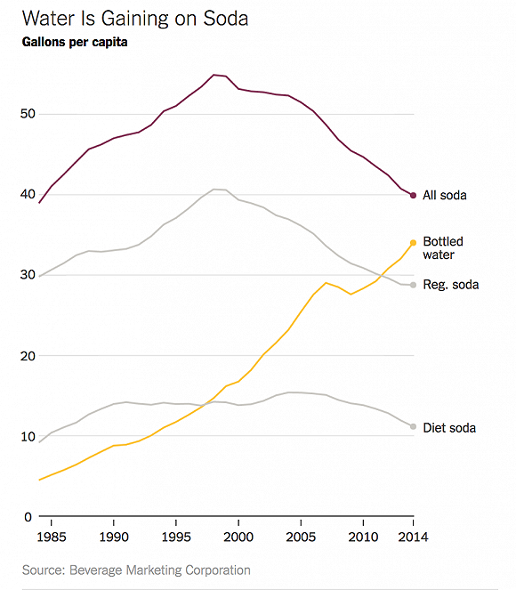 1960年代到1990年代,汽水公司經(jīng)歷過(guò)銷售量猛漲。而過(guò)去二十年里,汽水在美國(guó)的銷量暴跌了將近25%。而行業(yè)調(diào)研機(jī)構(gòu)Beverage Digest最新數(shù)據(jù)顯示,美國(guó)汽水2016年的銷量滑入了近31年來(lái)的最低谷,較去年銷量又降低了0.8%。