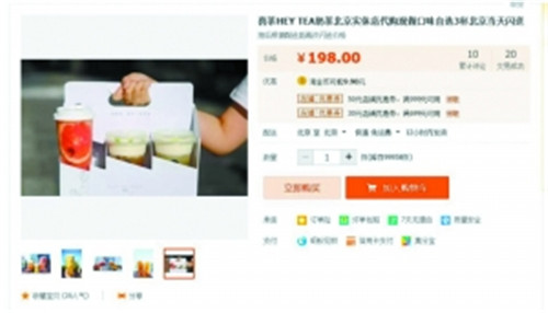 北京市場已有淘寶商家專門做起喜茶代購的服務。北京商報記者在一家提供喜茶代購服務的網(wǎng)店中注意到,代購一杯喜茶的跑腿費用報價為66元,3杯起送,即一次代購產(chǎn)生的跑腿費用至少為198元。