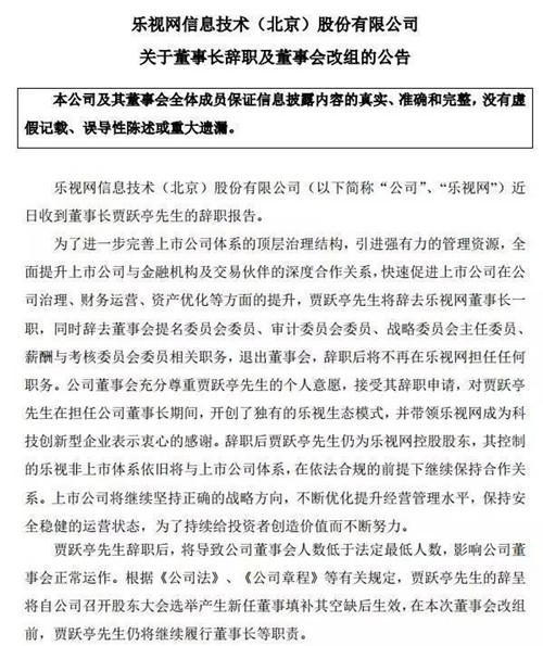 賈躍亭退出了在樂(lè)視網(wǎng)的任職,孫宏斌則將進(jìn)入董事會(huì)。