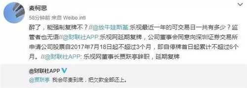 另外,關(guān)于樂(lè)視網(wǎng)股票復(fù)牌的事情,公告也一并做了回復(fù):公司董事會(huì)同意向深圳證券交易所申請(qǐng)公司股票自2017年7月18日起不超過(guò)3個(gè)月,即自停牌首日起累計(jì)不超過(guò)6個(gè)月。