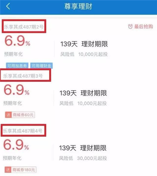 樂(lè)視金融APP上在售的樂(lè)享其成系列產(chǎn)品顯示,其中487期2號(hào)、3號(hào)和4號(hào)產(chǎn)品的投資期限完全相同,收益率也同為6.9%,并且都是7月7日起計(jì)算利息,只是2號(hào)和3號(hào)產(chǎn)品的理財(cái)起點(diǎn)起1萬(wàn)元,4號(hào)產(chǎn)品的理財(cái)起點(diǎn)為3萬(wàn)元。