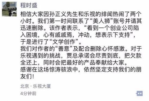 程時(shí)盛在朋友圈中寫到:相信大家因?qū)O正義先生和樂(lè)視的緋聞熱鬧了兩個(gè)小時(shí)。我們第一時(shí)間聯(lián)系了“美人獅”賬號(hào)并請(qǐng)其迅速刪除。該作者表示,“看到一個(gè)創(chuàng)業(yè)公司陷入困境,心有戚戚焉,沖動(dòng),想表示下支持”,于是進(jìn)行了“文學(xué)創(chuàng)作”。我們對(duì)作者的“善意”及配合刪除心懷感激。對(duì)于樂(lè)視遇到的挑戰(zhàn),賈總承諾會(huì)盡責(zé)到底,把欠款全還上,同時(shí)會(huì)把最好的產(chǎn)品奉獻(xiàn)給大家。感謝在這場(chǎng)驚濤駭浪中,依然堅(jiān)定支持我們的朋友們!