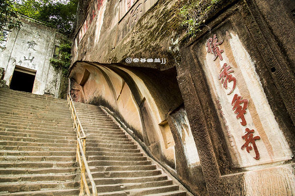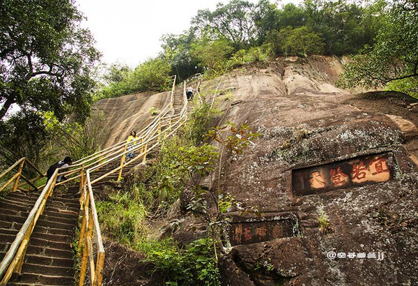 丹梯鐵鎖位于中層風(fēng)景區(qū)至山頂?shù)膽已虑捅谏?,下接“呼吸通天”。原中層到上層,本無道路可通,后來經(jīng)人工在這里開鑿石階,旁邊輔以鐵鎖鏈,方成通道,并以“丹梯”命名。