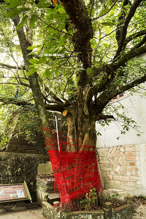 鴛鴦樹生長在六祖堂舊址旁邊。遠(yuǎn)看,它婷婷玉立如一體,枝葉婆娑不分彼此;近看,則可辨清樹干一里一外,兩種不同科目的樹相互依存。一株四百多歲的百日青,一株一百多歲的筆管榕,它們的樹葉交錯(cuò),各現(xiàn)姿容,好象久別重逢的情侶,互相擁抱著站立在幽靜的山谷間。