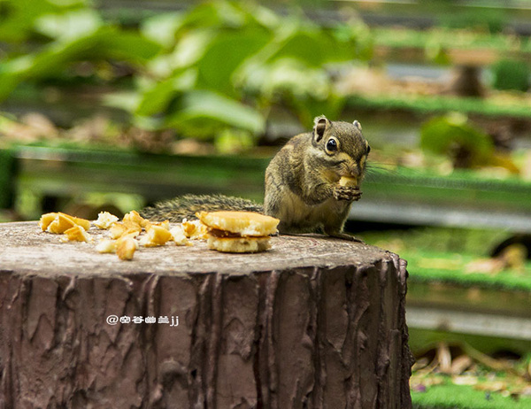 路遇可愛的小精靈,開始它還有些害怕,后來放在樹樁上食物,它的膽子就大了起來。