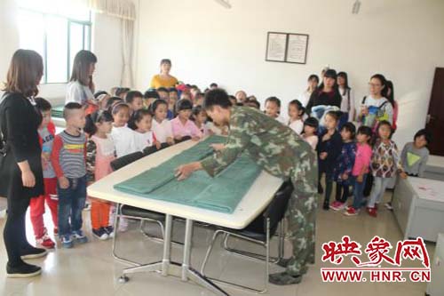 消防官兵給大家展示疊被子