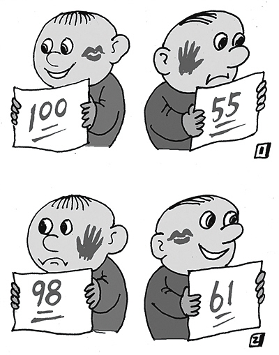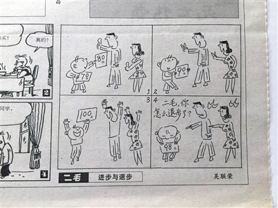 一個孩子考了100分,受到表揚。后來考了98分,結(jié)果被打了耳光;另一孩子考了55分,被打了耳光。第二次考了61分,卻受到表揚:這幅名為《進(jìn)步與退步》的四格漫畫,入選為2016年高考全國卷1的作文題目。