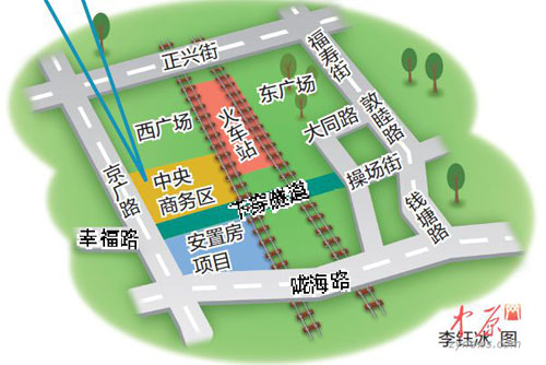讓人欣喜的是,西廣場南側(cè)的幸福路將連接火車站東西兩個廣場,打通下穿隧道。幸福路南起京廣路,北到操場街,不但可行駛機動車,還可供非機動車、行人通行。從規(guī)劃圖上可看出,規(guī)劃中的幸福路,和現(xiàn)狀幸福路,不在一條直線上,它們在京廣路上有拐角。
