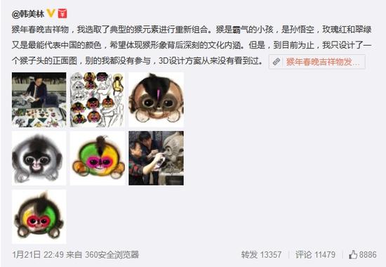 春晚吉祥物康康由“福娃”的創(chuàng)作者之一韓美林設(shè)計(jì),官方稱是以中國(guó)傳統(tǒng)水墨畫的藝術(shù)形式,生動(dòng)表現(xiàn)出“猴”的機(jī)靈活潑特點(diǎn)。看看韓老師的手稿,也是能get到喜慶的氛圍和毛茸茸的手感,還算是只討人喜愛的猴子↓