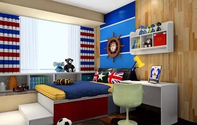 “這是一個男孩房設計,空間雖不大但是格局方正。設計師把榻榻米和飄窗一起裝進這個兒童房,不僅有了1.5米的床還能留出較寬敞的活動空間!”