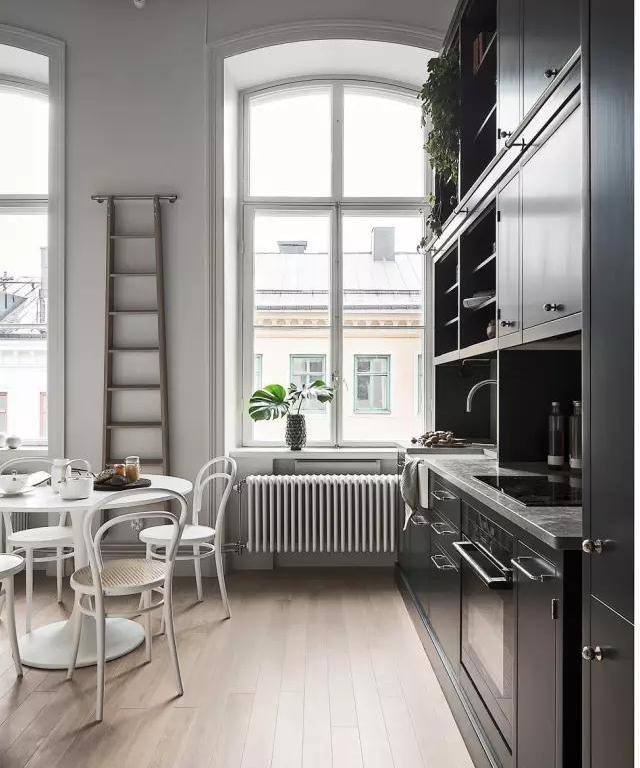 整個(gè)公寓的特點(diǎn)在于它足夠的層高,黑色廚房是空間的重心,同時(shí)也讓空間顯得更加優(yōu)雅簡(jiǎn)約。木色、金屬色以及植物盆栽是點(diǎn)綴這塊最好的裝飾。足夠的存儲(chǔ)空間,也許對(duì)于實(shí)用方面或許不夠便捷,然而木質(zhì)樓梯是很好的解決辦法。