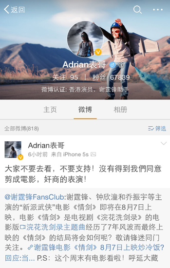 那么,《情劍》的兩位“主演”謝霆鋒與鐘欣桐為什么沒(méi)來(lái)宣傳本片呢?馬云對(duì)此表示:“兩位演員都還有別的戲要拍,沒(méi)時(shí)間來(lái)宣傳我們的電影?!钡皫兹崭勖絾?wèn)及了兩人的經(jīng)紀(jì)人霍汶希,對(duì)方稱《情劍》片方根本沒(méi)有通知他們上映的事,更沒(méi)有邀請(qǐng)二人宣傳。而在微博上認(rèn)證為“香港演員、謝霆鋒助手”的網(wǎng)友“Adrian表哥”也發(fā)微博指責(zé)片方并沒(méi)有得到謝霆鋒的同意,是奸商行為。另外,記者也查閱了《情劍》的官方微博,該官微在開(kāi)辦至今僅發(fā)7條微博,有90個(gè)粉絲??梢哉f(shuō),《情劍》除了一組有“抄襲嫌疑”的海報(bào)之外幾乎是在沒(méi)有任何宣傳的情況下推進(jìn)院線的。