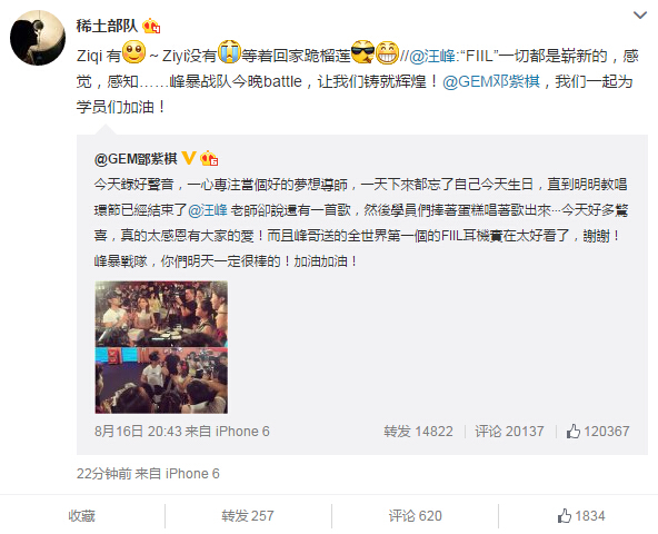 近日,一張章子怡發(fā)布會挺著“大肚”的照片引發(fā)網(wǎng)友熱議,雖然只是假扮孕婦,卻引來大波網(wǎng)友詢問何時準(zhǔn)備要寶寶,可見網(wǎng)友對兩人感情生活的關(guān)注。8月16日,鄧紫棋在微博上曬出汪峰為其過生日的照片,17日中午,汪峰轉(zhuǎn)發(fā)此微博并稱要為學(xué)員們加油,17日下午,章子怡回復(fù)汪峰:“Ziqi有~Ziyi沒有,等著回家跪榴蓮?!?/font>