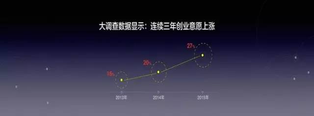 面向2016年,有創(chuàng)業(yè)意愿的受訪者比例高達(dá)27%,創(chuàng)業(yè)意愿連年攀升,“大眾創(chuàng)業(yè)、萬(wàn)眾創(chuàng)新”熱潮在持續(xù)發(fā)酵。