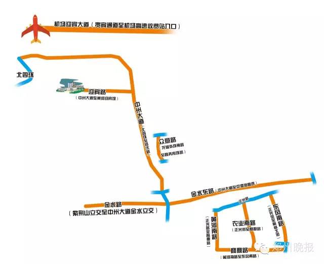 2、機(jī)場(chǎng)迎賓大道(貴賓通道至機(jī)場(chǎng)高速收費(fèi)站入口)、中州大道(北四環(huán)至鄭汴路)、迎賓路(中州大道至黃河迎賓館)、金水東路、(京港澳高速至中州大道)、金水路(中州大道金水立交至紫荊山立交立交)、黃河?xùn)|路(中州大道黃河立交至九如路)、眾意路(龍湖外環(huán)南路至商務(wù)內(nèi)環(huán)路)、黃河南路(正光路至商鼎路)、農(nóng)業(yè)南路(正光街至商鼎路)、東風(fēng)南路(正光街至榆林北街)、商鼎路(東風(fēng)南路至黃河南路)等道路和路段。經(jīng)過以上道路和路段的車輛和行人,遇到臨時(shí)交通管制時(shí),可以提前就近選擇其它道路繞行。