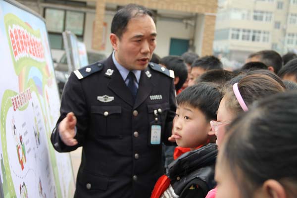 小學(xué)生們認(rèn)真聽警察叔叔講解安全知識