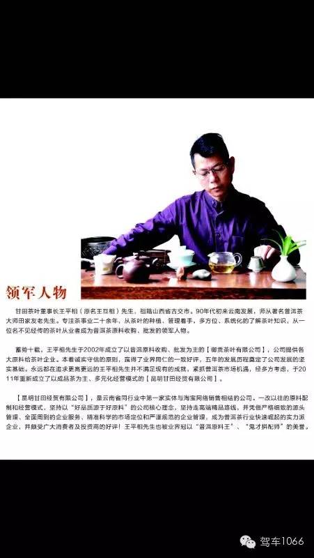 甘田茶葉董事長(zhǎng)王互相先生,是近年來(lái)普洱茶領(lǐng)域的傳奇人物之一,從事普洱茶產(chǎn)業(yè)研究二十余年,積累并沉淀了豐厚的普洱茶知識(shí)和經(jīng)驗(yàn)。長(zhǎng)年累月地深入云南省的各大普洱茶產(chǎn)區(qū)調(diào)研,被業(yè)界冠以“普洱原料王”“鬼才拼配師”等美譽(yù)。王互相先生早年曾是國(guó)內(nèi)某大型普洱茶企業(yè)的高級(jí)管理人員,工作多年后,鑒于對(duì)普洱茶產(chǎn)業(yè)的獨(dú)到見(jiàn)解,成立了以原料收購(gòu)和批發(fā)為主的“御貢茶葉”,為多家知名茶企提供原料支持地,深受業(yè)界好評(píng),后經(jīng)十年發(fā)展,于2011年重新創(chuàng)建了以成品為主,多元化經(jīng)營(yíng)模式的“昆明甘田經(jīng)貿(mào)有限公司”。