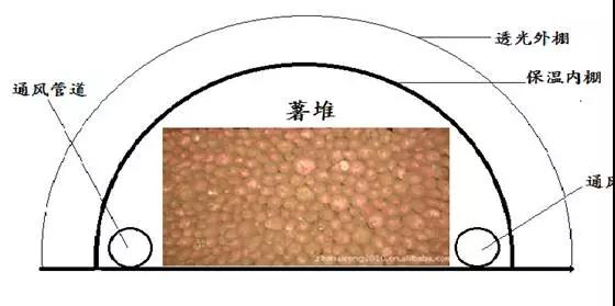 由塑料大棚外棚和內(nèi)部保溫棚組成,利用透光外棚獲取太陽(yáng)能熱量為薯堆加溫,內(nèi)棚用保溫材料覆蓋,在夜間能夠保持薯堆熱量,可用通風(fēng)管道對(duì)內(nèi)棚進(jìn)行補(bǔ)充新鮮空氣與熱量交換,達(dá)到安全越冬的目的。在貯藏初期氣溫偏高,讓薯堆風(fēng)吹日曬10-15天進(jìn)行自然愈合,提高貯藏的安全系數(shù)。
