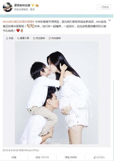 2015年8月8日林志穎發(fā)微博宣布陳若儀再次懷孕,一家三口的溫馨合照簡(jiǎn)直太有愛(ài)。