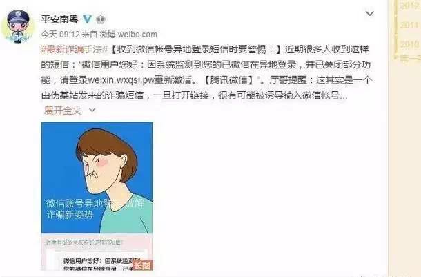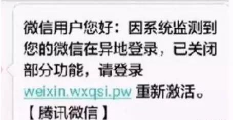 #最新詐騙手法#【收到微信帳號異地登錄短信時(shí)要警惕!】近期很多人收到這樣的短信:“微信用戶您好:因系統(tǒng)監(jiān)測到您的已微信在異地登錄,并已關(guān)閉部分功能,請登錄weixin.wxqsi.pw重新激活?!掘v訊微信】”。廳哥提醒:這其實(shí)是一個(gè)由偽基站發(fā)來的詐騙短信,一旦打開鏈接,很有可能被誘導(dǎo)輸入微信帳號、微信密碼、支付密碼、驗(yàn)證碼等,后果不堪設(shè)想……
