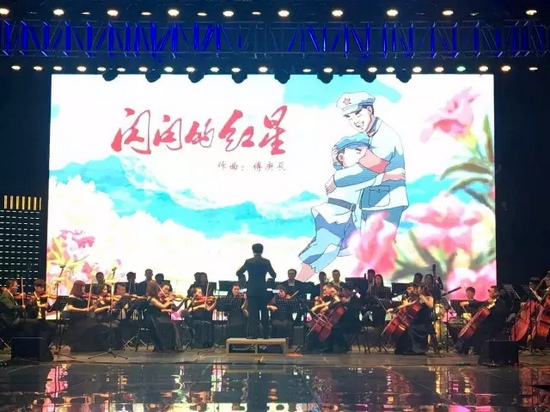 伴隨臺(tái)上指揮黃俊博的手勢(shì)起,河南愛樂樂團(tuán)開始演奏交響樂《紅旗頌》。