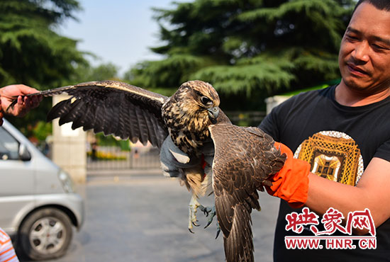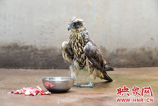 “這是一只獵隼,在我國(guó)屬于國(guó)家二級(jí)重點(diǎn)保護(hù)動(dòng)物。蒙古國(guó)政府在2012年決定,將獵隼確定為蒙古國(guó)“國(guó)鳥”。蒙古國(guó)官方數(shù)據(jù)顯示,蒙古國(guó)境內(nèi)現(xiàn)存獵隼約6800只。由于它分布在蒙古國(guó)和我國(guó)的新疆、甘肅以及內(nèi)蒙古等地,而在我們河南沒有分布,因此十分罕見。從它頭頂色絨毛還沒退去就可以看出,它是今年剛孵化出來兩個(gè)多月的幼鳥。它的右翅膀第四、第五根飛羽有斷裂,右爪輕微擦傷,另外它患有非常嚴(yán)重的腸炎。這只獵隼,應(yīng)該是被人非法飼養(yǎng)后逃逸出來的,由于其野外捕食能力差,饑腸轆轆,體力不支,飛不起來,后被好心村民發(fā)現(xiàn),要不然是不可能逮住的。也多謝這位好心村民,要不然,它極易受到野狗野貓和其他大型猛禽襲擊或者落入不法分子手中牟取暴利?!倍鹃L(zhǎng)說。