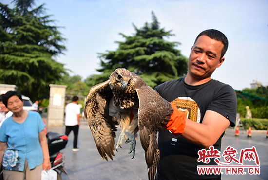 為了向圍觀市民普及一下鳥類知識(shí),董朝偉站長(zhǎng)當(dāng)眾對(duì)獵隼進(jìn)行了初步檢查。
