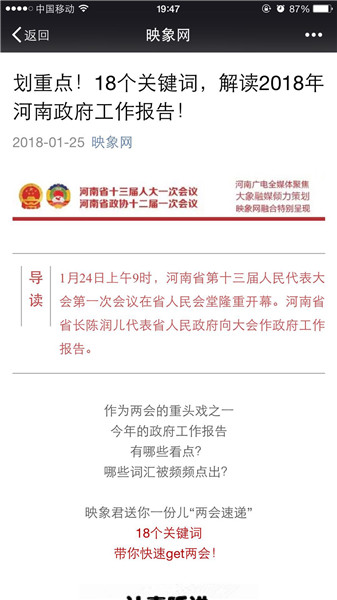 映象網(wǎng)官方微信策劃推出原創(chuàng)策劃《河南人,2018給你穩(wěn)穩(wěn)的幸福!》、《你好,我是河南!這是我的五年成績單,請接收!》、《2018年,河南都有哪些“小目標(biāo)”?》、《劃重點(diǎn)!18個(gè)關(guān)鍵詞,解讀2018年河南政府工作報(bào)告!》。每篇都刷屏朋友圈,網(wǎng)友積極轉(zhuǎn)發(fā)點(diǎn)贊,稱“看完真的覺著穩(wěn)穩(wěn)的幸?!?。