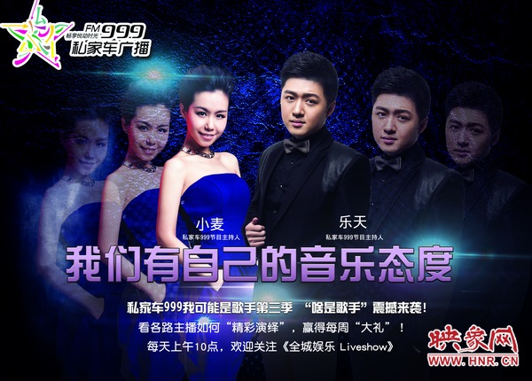 自3月30日起,上午10點(diǎn)至11點(diǎn)私家車999《全城娛樂live show》,“我可能是歌手”第三季期待你的收聽!