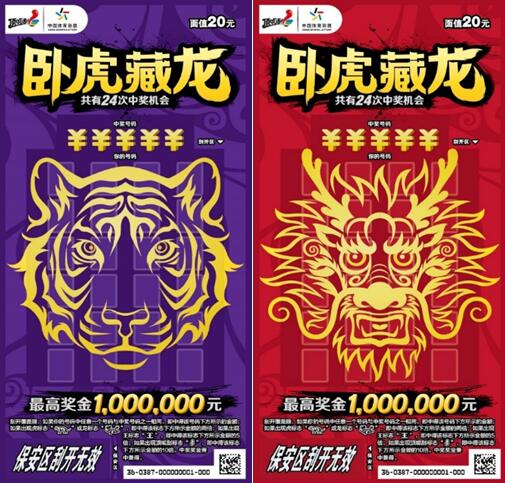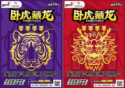 本次上市的“臥虎藏龍”主題即開套票,共有5元、10元、20元三種面值。票面設(shè)計(jì)色彩濃郁、霸氣美觀,“虎頭”、“龍頭”標(biāo)識躍然于票面正中,“眼神”犀利且極富“挑戰(zhàn)”意味,寓意充滿自信,敢于挑戰(zhàn)最高獎(jiǎng)金。