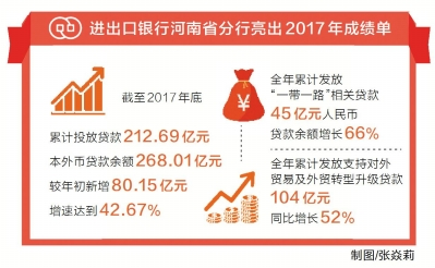 1月29日,進(jìn)出口銀行河南省分行行長(zhǎng)吳啟金表示,過(guò)去一年,分行努力貫徹習(xí)近平新時(shí)代中國(guó)特色社會(huì)主義思想,助力河南打造內(nèi)陸開(kāi)放新高地。截至2017年底,進(jìn)出口銀行河南省分行累計(jì)投放貸款212.69億元,本外幣貸款余額268.01億元,有力助推我省企業(yè)“走出去”。