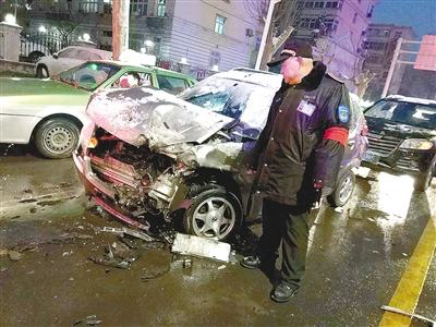 日暮雪大,路上結(jié)冰,一輛雪鐵龍由北向南行駛,撞上兩輛汽車與一輛公交車,雪鐵龍轎車司機(jī)滿身酒氣,被警方帶去醫(yī)院抽血取證。圍觀市民看到路口被堵,紛紛譴責(zé)這名涉嫌酒駕的司機(jī):明知雪天路難走,還違法駕駛,真是不應(yīng)該。