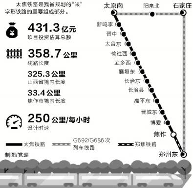 太焦鐵路是我省規(guī)劃的“米”字形鐵路的重要組成部分,項(xiàng)目投資估算總額為431.3億元,線路長度358.7公里,其中山西省境內(nèi)325.3公里,我省焦作市境內(nèi)33.4公里。工程計(jì)劃建設(shè)周期為5年,設(shè)計(jì)時速為每小時250公里。全線設(shè)太原南、新鳴李、晉中、太谷東、榆社西、武鄉(xiāng)西、襄垣東、長治東、長治縣、高平東、晉城東、博愛及焦作13個車站。
