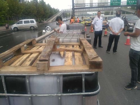 據(jù)貨車司機介紹,他車上拉的這些邊長約1米的方形大桶是裝醬油用的,當天拉著這些空桶從新鄭來到鄭州,因?qū)β窙r不熟,不知道此處上橋口有3米的限高桿,直到上橋時撞上限高桿后,才知道貨車不讓上三環(huán)立交橋。