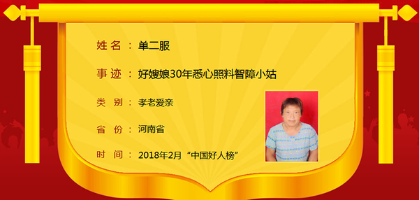 自從1987年嫁到丈夫郭星奎家后,單二服就一直把智障的小姑子郭紅勤當(dāng)成自己的親妹妹精心照料。2010年,單二服的婆婆去世,再加上丈夫外出打工,照顧智障小姑子的重任,就落到了她一個人的身上,但單二服毫無怨言繼續(xù)關(guān)心、照顧著婆家小姑子。30年來,她用平凡而又偉大的愛心感動了周圍的人,被鄉(xiāng)鄰廣為稱贊。(安艷鴿)