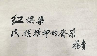 采訪結(jié)束時(shí),楊老不顧身體勞累,為“大河報(bào)紀(jì)念紅旗渠通水50周年特刊”題寫(xiě)刊名:“紅旗渠民族精神的脊梁”。