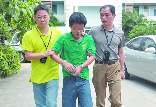 昨日,深圳警方將多次撥打電話謊稱(chēng)飛機(jī)上有炸彈的犯罪嫌疑人王某(中)刑拘。 新華社發(fā)