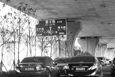 與橋上的暢通相比,由于橋下紅綠燈較多,通行速度受到很大影響。昨日上午8時,記者從南三環(huán)中州大道交叉口出發(fā),向西沿順時針方向行駛,沿途走的是地面輔道。雖然正值早高峰,不過南三環(huán)車流量并不大,車速可以達到30公里/小時。沿南三環(huán)到京廣路口時,由于京廣路立交正在施工,雙向堵塞比較嚴重,只能從附近道路繞行,耗時比較多。