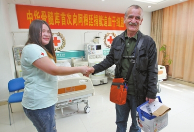 4月18日14時(shí)44分,黃發(fā)碧眼的志愿者喬治(英文全名:GeorgesJeanMarianelli),走進(jìn)河南省腫瘤醫(yī)院造血干細(xì)胞采集室,徑直走到病床邊,向正躺在病床上采集造血干細(xì)胞的河南姑娘武佳微笑示意,走上前去說(shuō)“你好”,并為她豎起大拇指。幾分鐘后,病床邊的造血干細(xì)胞采集機(jī)停止運(yùn)轉(zhuǎn),這位26歲的河南姑娘捐獻(xiàn)的199毫升造血干細(xì)胞混懸液,被醫(yī)護(hù)人員小心翼翼地取下……這份飽含河南大愛的“生命種子”,將搭乘飛機(jī),輾轉(zhuǎn)被送到萬(wàn)里之外的阿根廷,為一名8歲白人兒童送去生命希望。