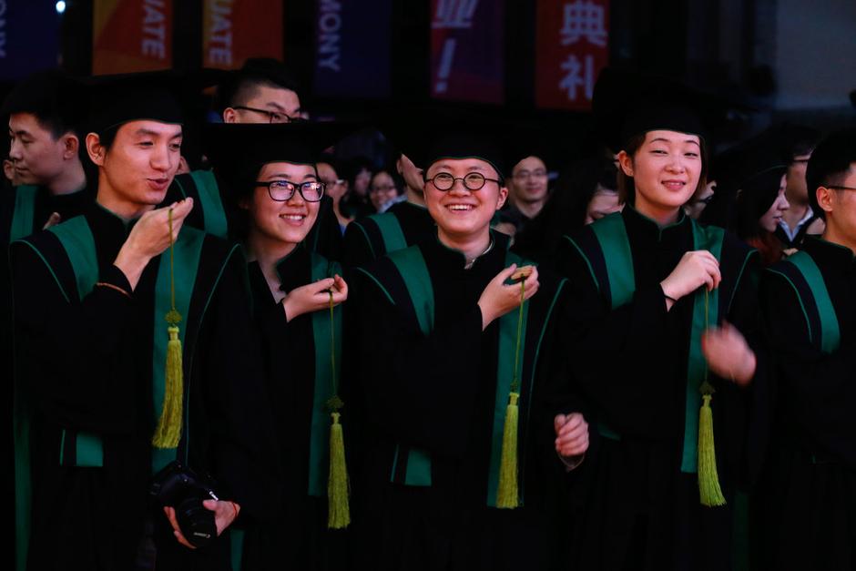 圖為畢業(yè)典禮上分別身著博士服、導師服、碩士服(從左到右)亮相的學生老師。