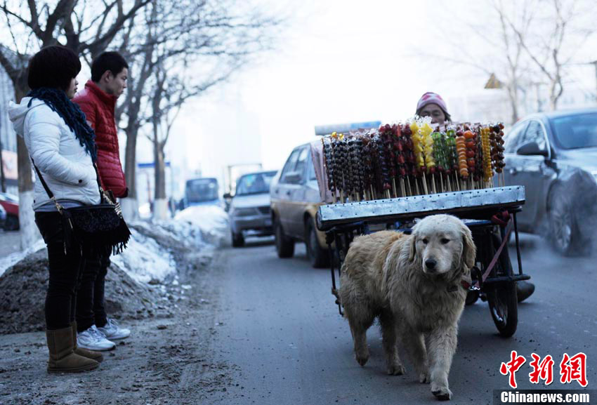 2月6日,在長春市一條繁華的街路上,一只小狗幫助身殘主人拉車賣冰糖葫蘆,成為長春冬日街頭一道感人的風(fēng)景線。據(jù)主人介紹,雖然自己身殘且貧窮,但并不想靠別人救濟(jì)度日,因此學(xué)會(huì)了制作冰糖葫蘆的手藝,并以此自食其力。而他養(yǎng)的這條小狗“大黃”也是對(duì)主人不離不棄,每日都會(huì)幫助主人拉車外出謀生。圖為小狗拉著主人的糖葫蘆車走在繁華的街道上。張瑤 攝