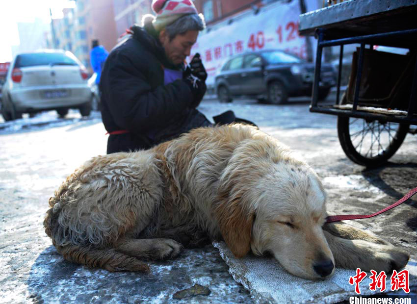 2月6日,在長春市一條繁華的街路上,一只小狗幫助身殘主人拉車賣冰糖葫蘆,成為長春冬日街頭一道感人的風(fēng)景線。據(jù)主人介紹,雖然自己身殘且貧窮,但并不想靠別人救濟(jì)度日,因此學(xué)會(huì)了制作冰糖葫蘆的手藝,并以此自食其力。而他養(yǎng)的這條小狗“大黃”也是對(duì)主人不離不棄,每日都會(huì)幫助主人拉車外出謀生。圖為主人走累了抽根煙歇息的時(shí)候,小狗也在旁邊小憩一下。張瑤 攝
