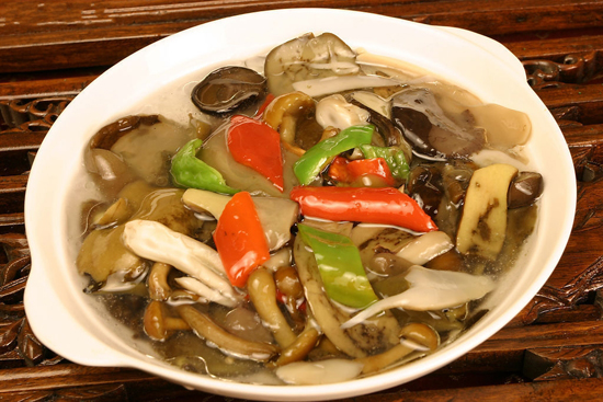 青松翠柏牛肝菌是用昆明特有的虎皮青椒,也就是云椒烹制的,肉厚味清香。在牛肝菌過(guò)油變色后立即加入云椒塊,大火爆炒,換小火加適量鹽即可出鍋。幾乎沒(méi)有其他調(diào)味料,純粹考驗(yàn)食材的鮮香本味——醬香和清香相輔相成,天然去雕飾。