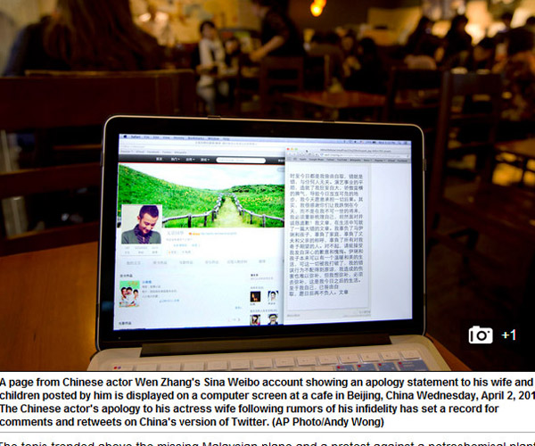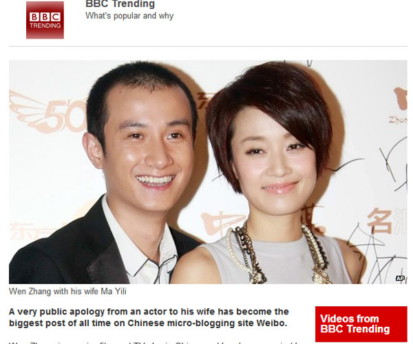 終于,出現(xiàn)在外國媒體報道中的華人明星名字不再只是鞏俐、章子怡等國際腕兒了。霸占國內(nèi)娛樂圈頭條的“文章出軌事件”,已經(jīng)漂洋過海到了全球各地,出現(xiàn)在多家國外媒體的版面上。包括英國BBC、《每日郵報》、美國《美聯(lián)社》、《紐約每日新聞報》、《好萊塢記者報道》、《娛樂在線》、澳洲《悉尼先驅(qū)晨報》、加拿大CBC、越南《民智報》新聞網(wǎng)站(dantri.com.vn)等多家外媒都對此事進(jìn)行了報道,并集體關(guān)注文章道歉微博所打破的社交媒體轉(zhuǎn)發(fā)記錄。