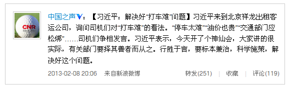 【習(xí)近平:解決好“打車難”問題】習(xí)近平來到北京祥龍出租客運(yùn)公司,詢問司機(jī)們對“打車難”的看法。“停車太難”“油價(jià)也貴”“交通部門應(yīng)松綁”……司機(jī)們爭相發(fā)言。習(xí)近平表示,今天開了個(gè)神仙會,大家講的很實(shí)際,有關(guān)部門要擇其善者而從之。行勝于言,要標(biāo)本兼治,科學(xué)施策,解決好這個(gè)問題。
