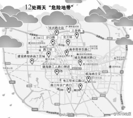 鄭州市政工程管理處養(yǎng)護科負責人介紹說,經(jīng)過排查,市區(qū)內有12個區(qū)域,一遇強降雨,極易出現(xiàn)較深積水,造成相關路段交通斷行。希望廣大市民在強降雨天氣條件下,繞行以下這些區(qū)域: