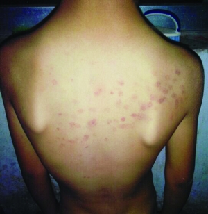 10月8日,謝女士在給小韋洗澡時(shí),發(fā)現(xiàn)孩子的后背上都是紅斑,像是被什么硬東西戳傷的。從謝女士提供的照片可以看到,小韋的后背上是成片的紅斑,記者粗略地?cái)?shù)了一下,紅斑超過50個(gè)。“當(dāng)時(shí)我問他是怎么搞的,孩子也不說,我以為是在學(xué)校玩摔倒弄的,就沒再追問。”