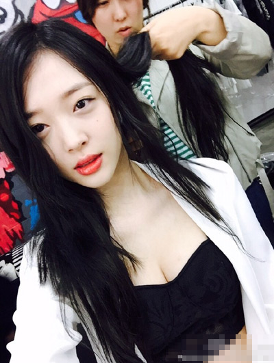 韓國偶像歌手雪莉曬自拍5月30日晚,韓星雪莉在微博上曬出自拍照,照片中雪莉身穿吊帶蕾絲裙,妝容精致鎖骨性感。