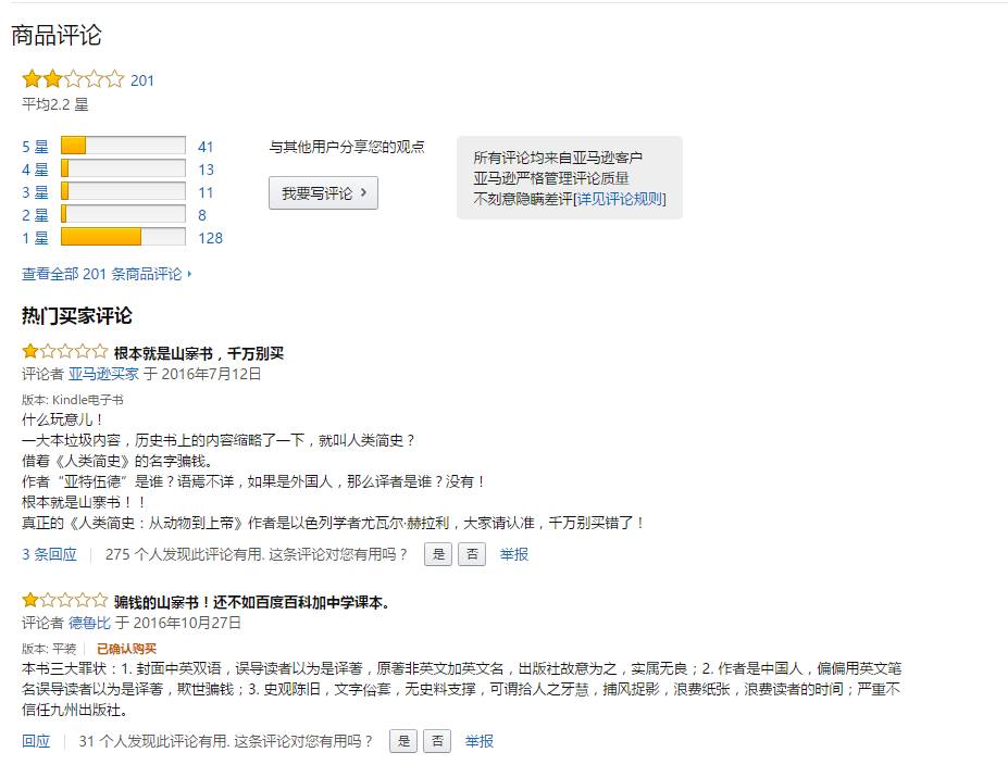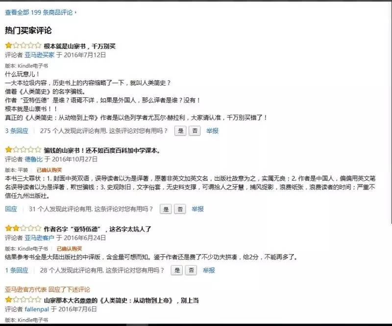 但是,這200條評論有54條好評,絕大部分評價時間集中于2016年5月15日與16日兩天,且不乏以“前500名評論者”為標簽較有影響力的評論者的身影。其中某些好評更是“驢唇不對馬嘴”,被讀者識破為是對尤瓦爾《人類簡史》的評價。